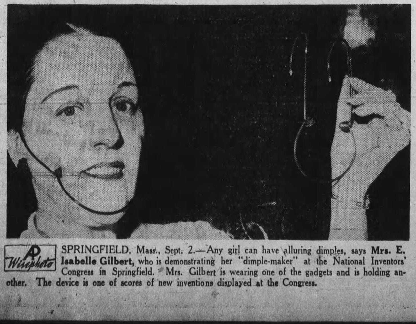 The modern dimple-maker dates to February 1926 when Mrs. E. Isabella Gilbert received a patent for her Dimple Maker.3 In the below photo, Gilbert demonstrates her invention at the National Inventors Congress held in Springfield, Massachusetts in September 1936.4 She would spend nearly two years making the rounds at similar conferences.